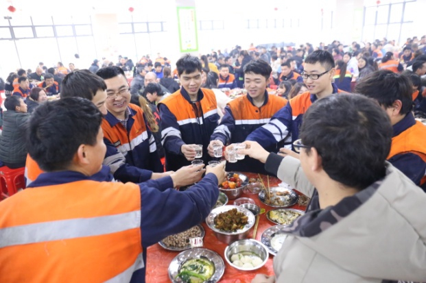 大家举杯畅饮丰收美酒,欢声笑语共庆除夕。席间,青拓集团行政总经理钟盛江及各子公司领导与员工碰杯祝福新年,丰盛而热气腾腾的年夜饭,让员工感受到家的温暖,增强了员工的归属感、幸福感。