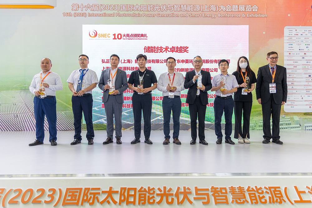 SNEC第十六届(2023)国际太阳能光伏与智慧能源(上海)大会暨展览会“10大亮点发布”在25日下午举行,兰钧新能源314Ah电芯作为本次展会的十大亮点之一再次登上舞台。26日,在“10大亮点颁奖典礼”上,兰钧新能源凭借314Ah电芯亮点推荐获得“储能技术卓越奖”殊荣。