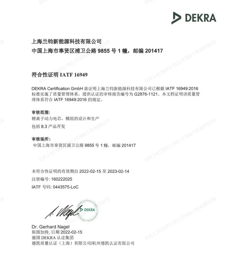 一直以来,上海兰钧新能源科技有限公司积极准备IATF16949汽车行业质量管理体系认证工作,并于近期顺利通过了德国机动车协会(DEKRA)的审核,2月15日正式收到了IATF16949 2016汽车行业质量管理体系LOC认证证书和ISO:9001 2015证书。IATF16949体系要求内容包含了ISO体系所有内容,是更高更全面的体系,获得此项认证对于兰钧新能源意义重大。