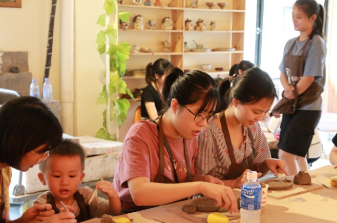 14时,活动正式开始,包含拉胚和捏塑两项陶艺体验项目。陶艺老师首先给每人发了一块陶泥,讲解了手工揉泥相关知识与要求、简单拉胚的技巧和注意事项以及相关工具的使用方法,最后简单示范了制作步骤流程。看似简单的陶艺,其实有着复杂的过程,制作陶艺要求有充足的耐心,还要讲究技术与细心,根据老师的指导,大家充分发挥想象力和创造力,制作出一个个属于自己的陶艺作品。