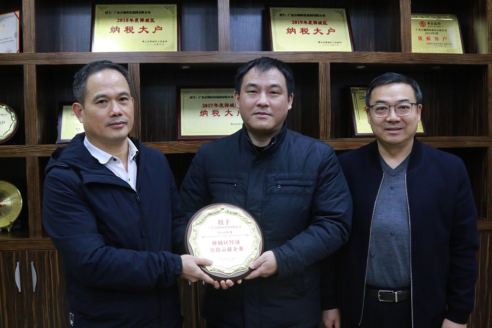 1月8日上午,佛山禅城区经济和科技促进局局长李凯一行到访吉瑞公司,向吉瑞公司颁发“2019年度禅城区经济突出贡献企业”奖牌,公司副总裁张胜、行政副总经理戴学军给予了热情接待。