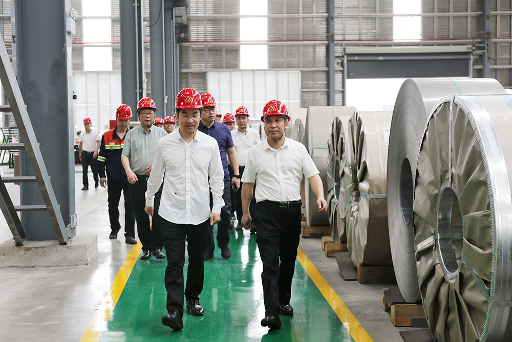 周祥祺一行还在姜海洪的带领下深入克虏伯二期项目现场,察看青拓不锈钢冷轧及深加工配套项目建设进展情况。姜海洪指出:该项目的顺利投产进一步丰富了青拓产业集群产品结构,将企业板材产品厚度最薄轧制至0.05毫米,具备市场竞争优势。