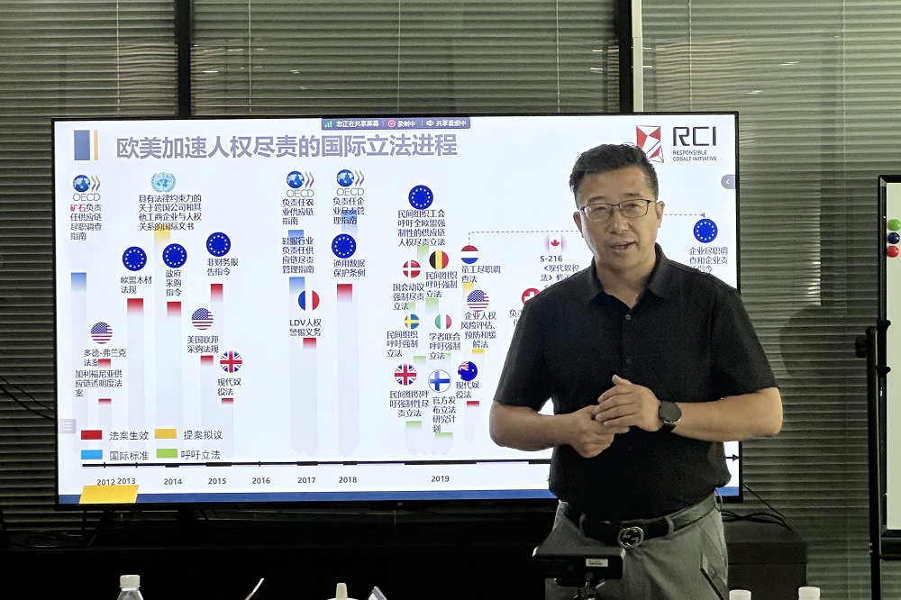 中国五矿化工进出口商会主任孙立会做了题为《国际规则重构背景下矿产及电池行业面临的ESG风险与应对实践》的专题辅导。他深度介绍了国际规则趋势、德国人权法规、欧盟电池法规、采矿业ESG风险、供应链的风险、尽责管理体系;针对欧盟新电池法规,重点分析法规的形成过程、主要内容、带来的挑战及应对策略;参考《中国矿产供应链尽责管理指南》,详细分析供应链尽责管理过程的“六步法”,即建立企业尽责管理体系、风险识别与评估、风险预防和缓解、内外部评估、报告与沟通、适时提供条件或开展合作进行补救。