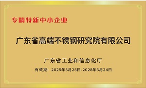 近日,广东省工业和信息化厅正式公布2024年专精特新中小企业认定名单,广东广青金属科技有限公司研究院(广东省高端不锈钢研…